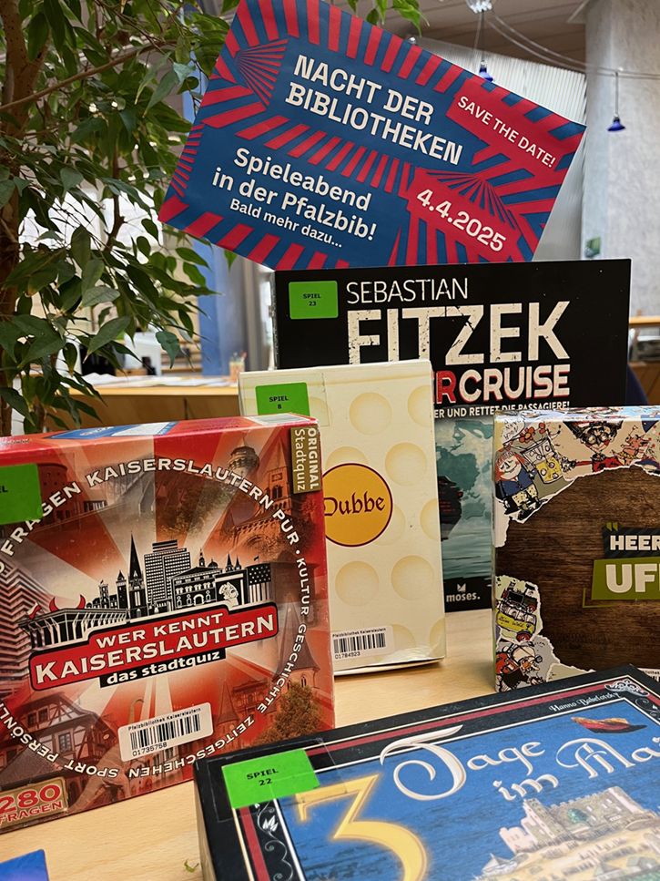 Unter dem Motto „Würfeln, knobeln, quizzen“ nimmt am Freitag, den 04. April 2025, von 19:00 bis 22:00 Uhr die Pfalzbibliothek des Bezirksverbandes Pfalz mit einer Spielaktion für Jung und Alt an der bundesweit ersten Nacht der Bibliotheken teil. In der Bismarckstraße 17 in Kaiserslautern werden dabei an verschiedenen Stationen ein digitales Escape-Room-Spiel sowie Brett- und Kartenspiele angeboten.