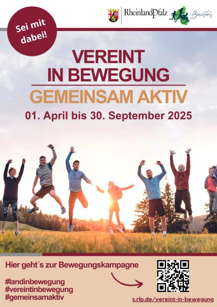 Nach der erfolgreichen Bewegungskampagne im vergangenen Jahr startet die Landesregierung am 1. April 2025 eine neue Bewegungskampagne im Rahmen der Landesinitiative „Rheinland-Pfalz – Land in Bewegung“. Unter dem Motto „Vereint in Bewegung – gemeinsam aktiv“ sind erstmals neben den rund 5.800 Sportvereinen auch die mehr als 32.000 anderen Vereine, dazu gemeinnützige Organisationen und öffentliche Einrichtungen in Rheinland-Pfalz dazu aufgerufen, im Zeitraum vom 1. April 2025 bis zum 30. September 2025 für alle Menschen leicht zugängliche und kostenfreie Bewegungs- und Sportangebote anzubieten.