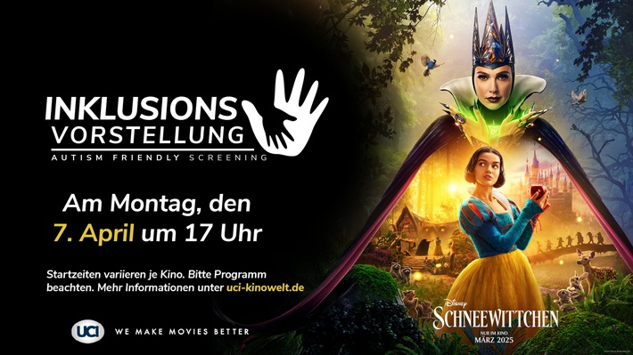 Die nächste Inklusions-Vorstellung von Disneys SCHNEEWITTCHEN findet am 7. April zur 17 Uhr-Vorstellung in allen UCI Kinos statt. Die Startzeiten variieren je Standort leicht. Hier bitte das aktuelle Programm beachten.