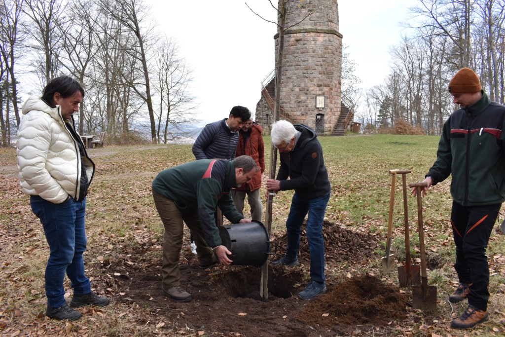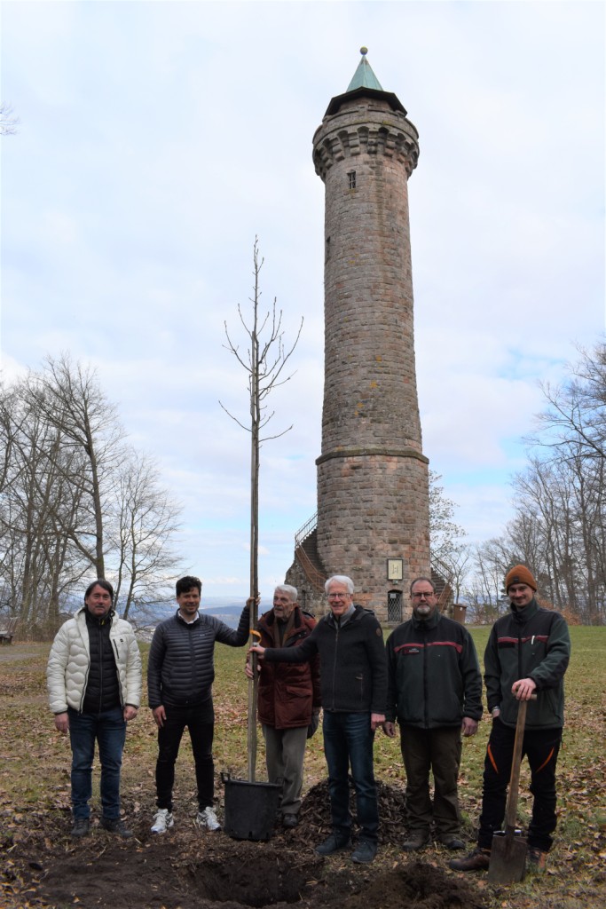Der Humbergturm wird in diesem Jahr 125 Jahre alt. Am Dienstag, 1. April, haben Beigeordneter Manuel Steinbrenner, Vertreter des städtischen Referats Grünflächen und dessen Forstabteilung sowie der Vorstand und Mitglieder des Humbergturm-Vereins gemeinsam anlässlich des Jubiläums einen Baum gepflanzt. Auf dem Platz vor dem Turm, neben der Informationstafel, wird fortan eine Elsbeere dem Humbergturm zur Seite stehen.