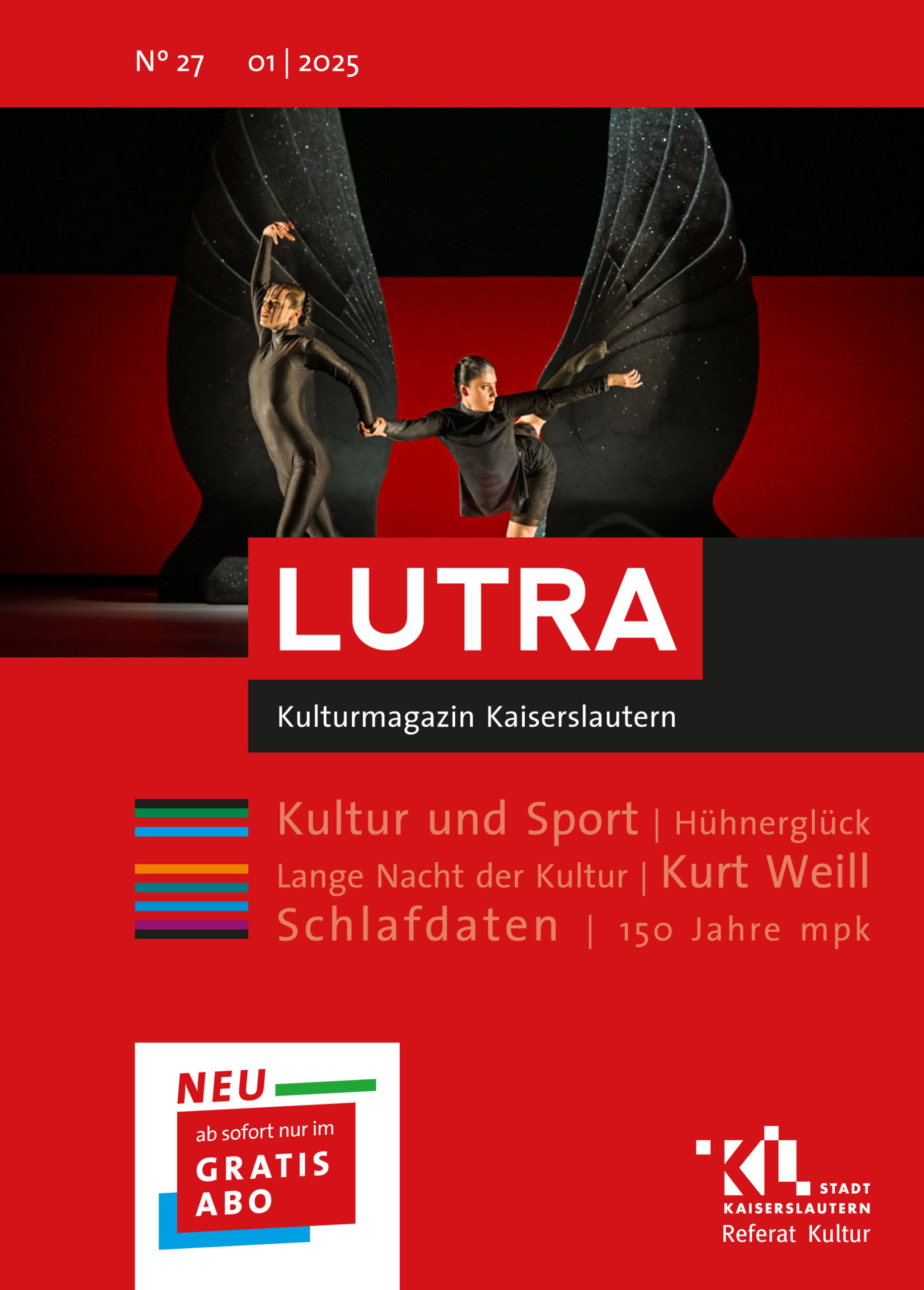 Ob und wie Kultur und Sport zusammenpassen, damit beschäftigt sich die neue Ausgabe des Kaiserslauterner Kulturmagazins LUTRA. Ab sofort ist sie an den bekannten Auslagestellen erhältlich oder kann kostenlos per Abo unter kultur@kaiserslautern.debequem nach Hause bestellt werden.