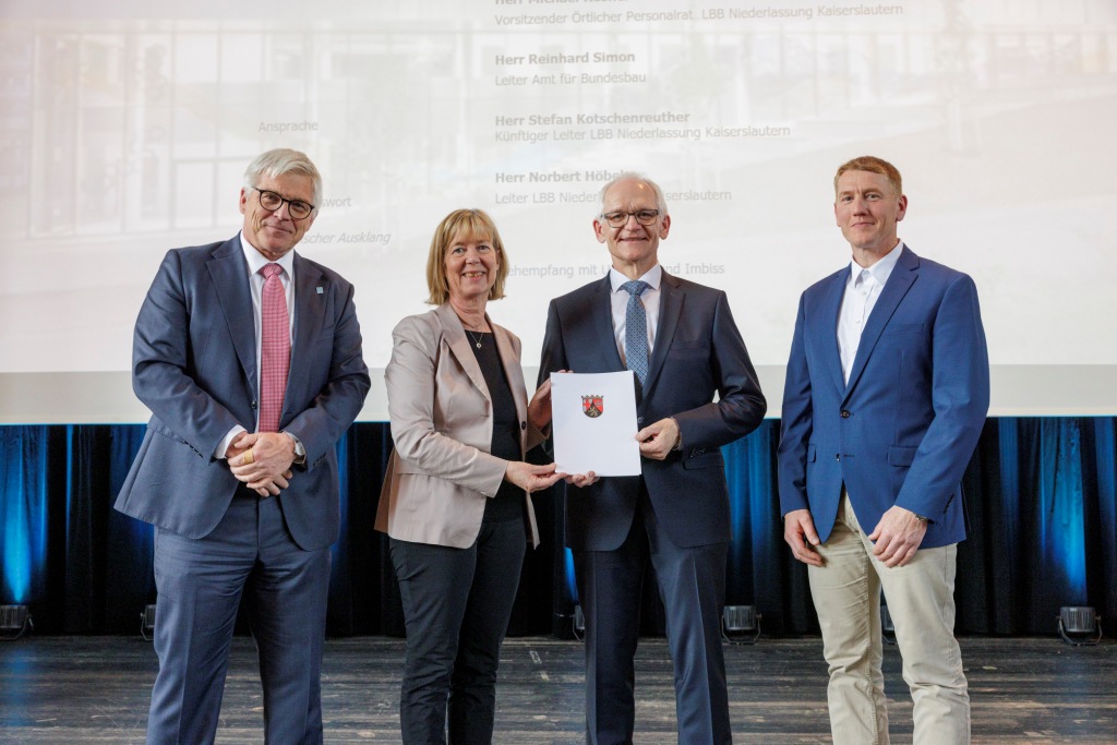Kaiserslautern – Finanz- und Bauministerin Doris Ahnen überreichte Höbel die Urkunde für seine Ruhestandsversetzung: „Für seinen wohlverdienten Ruhestand wünsche ich No- bert Höbel alles Gute. Wir verlieren mit ihm nicht nur einen sehr geschätzten Niederlas- sungsleiter, sondern auch eine Persönlichkeit, die sich stets der Herausforderung gestellt hat, mit vorausschauenden Ideen und Vorschlägen die Staatsbauverwaltung zukunfts- und leistungsfähig weiterzuentwickeln. Als Führungskraft war Herr Höbel stets beliebt, da er seinen Mitarbeiterinnen und Mitarbeitern mit großer Wertschätzung und Empathie be- gegnete. Für sein langjähriges Wirken möchte ich mich herzlich bedanken. Ab 1. Mai 2025 wird Stefan Kotschenreuther kommissarisch die Leitung der Niederlassung Kaiserslautern