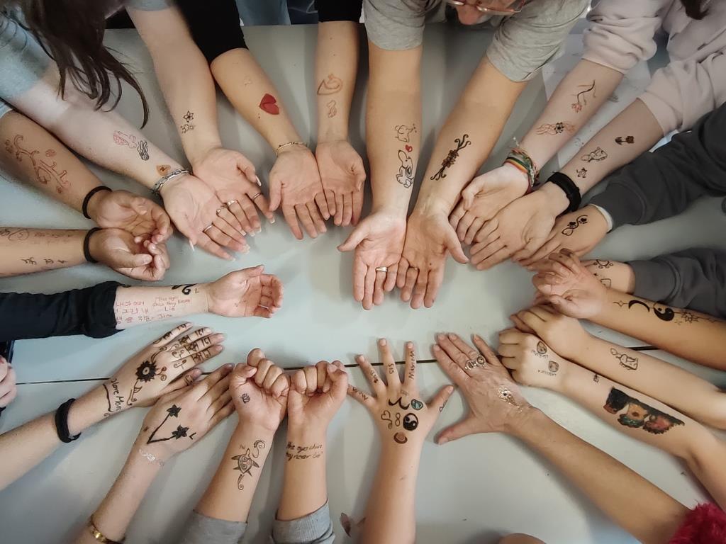 Am ersten Tag stand die theoretische Beschäftigung mit dem Thema im Vordergrund. Die Mädchen recherchierten am PC, entwarfen dann aber auch schon direkt eigene Symbole und fertigten erste Probezeichnungen auf Skizzenpapier – die als Highlight des Tages mittels speziellen Farben als temporäre „Tattoos“ auf Hände und Unterarme gemalt wurden.