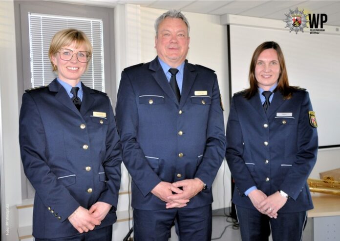 Zum offiziellen Amtswechsel am heutigen Montag bedankte sich Polizeipräsident Hans Kästner bei Carolin Henn für ihren Einsatz, ihr Engagement und die gute Zusammenarbeit in den vergangenen Jahren -weshalb er sie gerne in Kaiserslautern behalten hätte und nicht freiwillig nach Mainz abgegeben hat. Sie hinterlasse in der Westpfalz „große Fußspuren“, aber – und damit begrüßte der Behördenleiter Sarah Deutsch als Nachfolgerin – er ist sich sicher, dass die neue Leiterin des Führungsstabs „da gut hineinpasst“. Sie bringe durch ihre Erfahrungen aus ihren bisherigen Verwendungen alles mit, was sie in ihrer neuen Funktion brauche, habe sich in der kurzen Zeit im Präsidium auch schon sehr gut eingearbeitet und erste Einsätze bereits souverän gemeistert. Er freue sich auf eine gute und erfolgreiche Zusammenarbeit und drückte die Hoffnung aus, diese wichtige Stelle nicht so schnell wieder neu besetzen zu müssen.