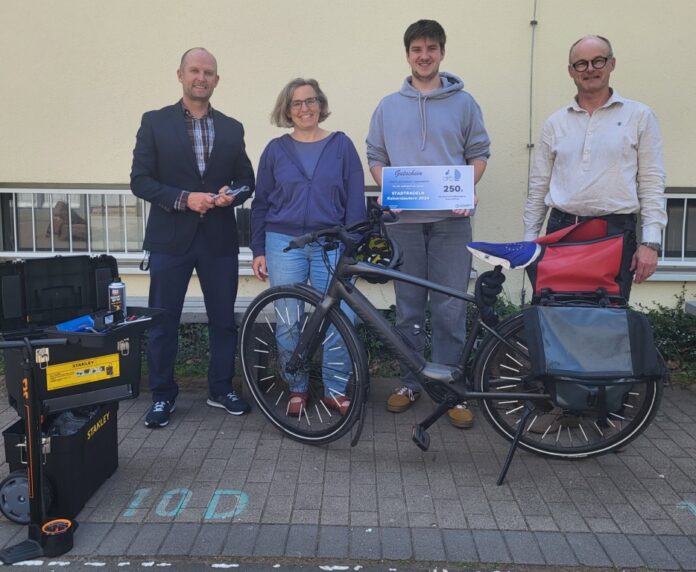 BU: ASG-Schüler Henri Schneider präsentiert beim Vor-Ort-Termin mit der städtischen Radverkehrsbeauftragten Julia Bingeser den Gutschein. Links Lehrer Manfred Bold, rechts Schulleiter Peter Leister.