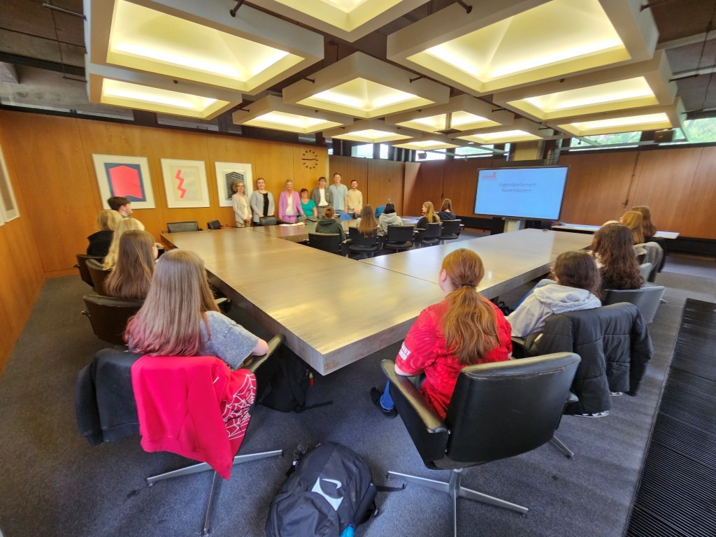 Im Kleinen Ratssaal bekamen die Schülerinnen aus erster Hand interessante Einblicke in das organisatorische Drumherum der Stadtpolitik, zunächst von der Ratsverwaltung, dann von Oberbürgermeisterin Beate Kimmel, die es sich kurz vor der Ratssitzung um 15 Uhr nicht nehmen ließ, vorbeizuschauen. Auch zwei Vertreter des Jugendparlaments waren mit dabei und erläuterten die Funktion und Struktur der Jugendvertretung. Die Schülerinnen selbst hatten den Ausflug ins Rathaus mit ihrer Lehrerin Lisa Stahlschmidt im Unterricht gut vorbereitet und warteten mit einer ganzen Liste von Fragen auf, die sie zum Thema Stadtrat interessierte. Auch die Tagesordnung hatten sie bereits gesichtet, sodass die einzelnen zu behandelnden Punkte bereits bekannt waren, als es um 15 Uhr dann rüber in den Großen Ratssaal ging, wo die Gruppe gut anderthalb Stunden lang von der Zuschauertribüne aus die Ratssitzung live verfolgen konnte.