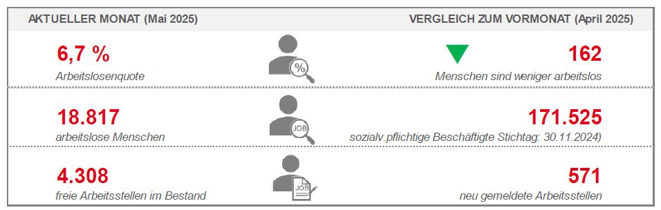 Die Unterbeschäftigung lag nach vorläufigen Angaben im Mai bei 22.565 Personen. Sie sank gegenüber dem Vormonat April (-223 Personen bzw. -1 Prozent) und erhöhte sich verglichen mit Mai 2024 (603 Personen bzw. 2,7 Prozent). Zur Unterbeschäftigung zählen neben den Arbeitslosen solche Personen, die nicht als arbeitslos gelten, weil sie beispielsweise im Rahmen von arbeitsmarktpolitischen Maßnahmen gefördert werden.