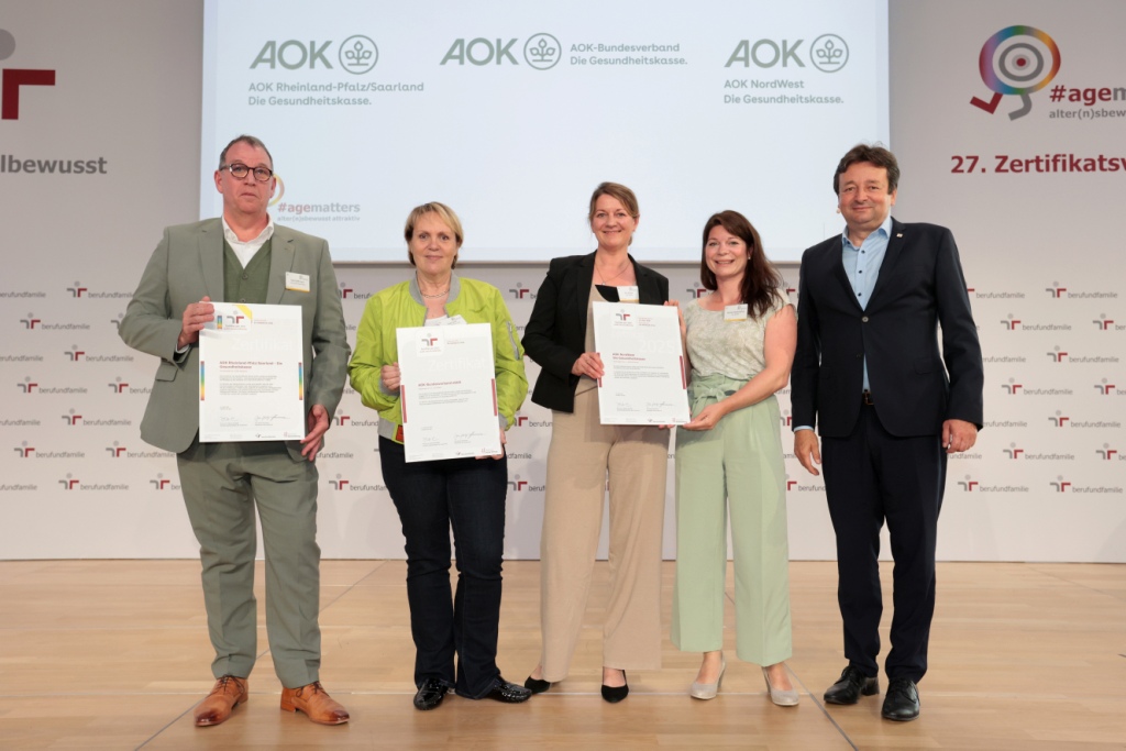 Die AOK Rheinland-Pfalz/Saarland ist für die Auszeichnung „Zertifikat zum audit berufundfamilie“ geehrt worden. Die Würdigung für ihre strategisch angelegte familien- und lebensphasenbewusste Personalpolitik fand im Rahmen eines Zertifikats-Events in Berlin statt.