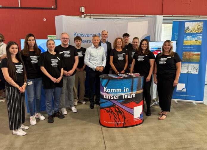 Landrat Ralf Leßmeister freute sich über das Engagement der Mitarbeiterinnen und Mitarbeiter der Kreisverwaltung. Zusammen mit Peter Weißler, Leiter der Agentur für Arbeit Kaiserslautern-Pirmasens, besuchte er verschiedene Stände der Aussteller, um sich ein Bild von den vielfältigen Ausbildungsmöglichkeiten in Stadt und Landkreis Kaiserslautern zu machen.