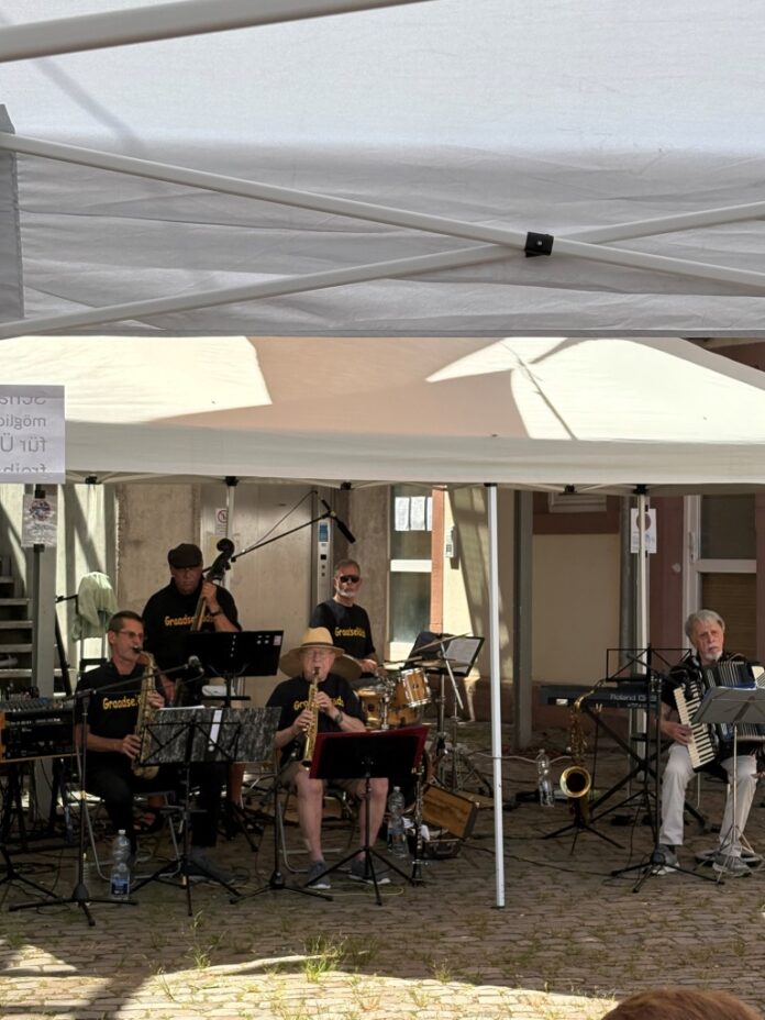Was für ein Tag! Bei strahlendem Wetter, guter Musik und bester Stimmung wurde die Jazz-Matinee mit Graadselääds am 29. Juni im Innenhof der Hasso-Saxonia zu einem echten Sommerhighlight im Unionsviertel. Über 150 Besucherinnen und Besucher folgten der Einladung des Fördervereins – und sie wurden nicht enttäuscht: Mitreißender Oldtime Jazz, frisch gezapftes Union Kellerbräu, duftendes Treberbrot und goldene Brüsseler Waffeln sorgten für ein Erlebnis mit allen Sinnen.
