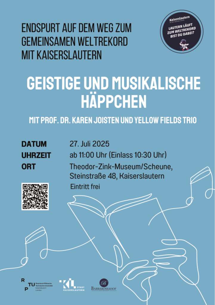 Geistige Häppchen werden von Prof. Dr. Karen Joisten gereicht. Sie ist Philosophin an der RPTU mit demSchwerpunkt Ethik der Digitalisierung.Geistige Häppchen sind geistige Stationen, an denen der Geist, der zu Fuß geht und in Bewegung ist, Haltmacht. Eine solche Station ist z. B. der olympische Gedanke, der nach wie vor brandaktuell ist, da er denMenschen ganzheitlich in den Blick nimmt. An einer anderen Station finden wir Herausforderungen derDigitalisierung mit der einen oder anderen Chance oder ihren Risiken. Und natürlich gibt es eine geistigeStation zum Menschenbild, bei dem der Mensch mit seinen Mitmenschen untrennbar verbunden ist. Denn nurgemeinsam schaffen wir den Weltrekord mit Kaiserslautern! Musikalische Häppchen sind eigenständige musikalische Kompositionen des Yellow Fields Trios. Das Trio besteht aus Johannes Eichhorn (E-Gitarre), Philipp Becker (E-Bass) und Lorenz Schuster(Perkussion und Gesang). Es bietet eine originelle und sehr rhythmische Musik, die zwischen Jazz, Funk undPop zu verorten ist. Immer wieder gibt es improvisierende Passagen, die überraschen und Freude erregen. Siehaben eigens ein neues Lied für den gemeinsamen Weltrekordversuch mit Kaiserslautern komponiert undfreuen sich auf die Erstaufführung. Das Lied hat den Titel: „Höher, schneller, weiter – Hand in Hand“.