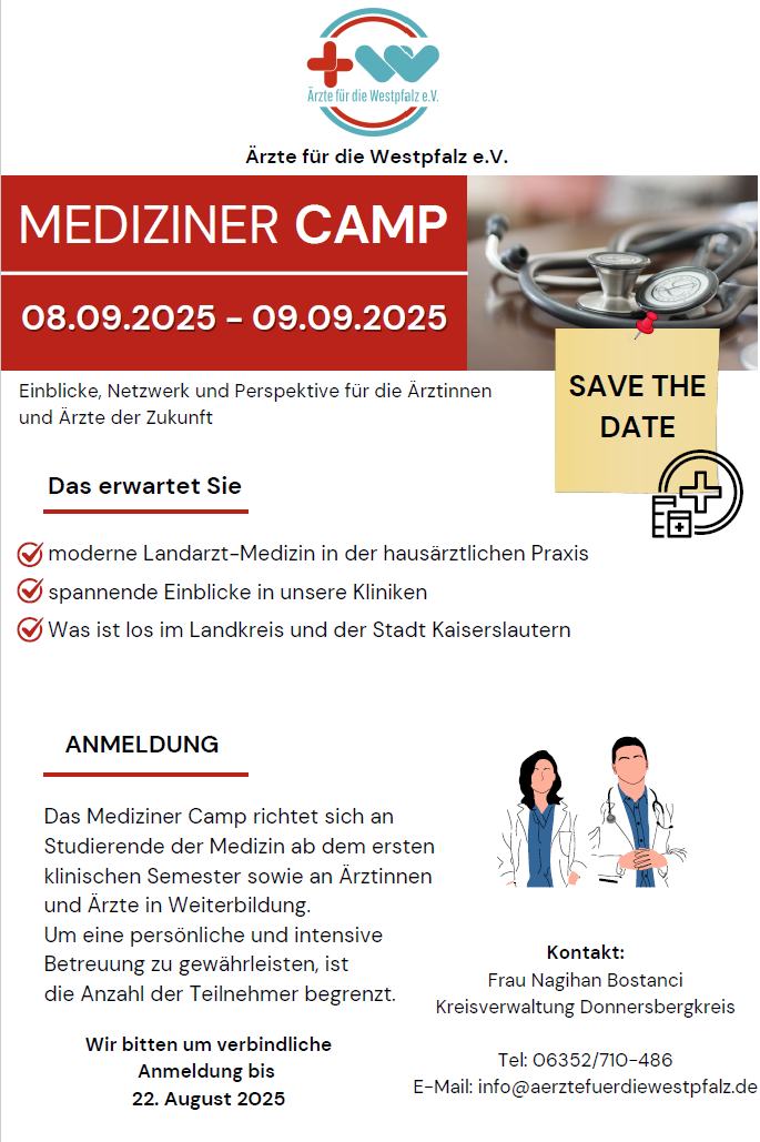 Am 8. und 9. September 2025 richtet der Verein „Ärzte für die Westpfalz“ ein Mediziner-Camp aus. An den zwei Tagen gibt es für Teilnehmerinnen und Teilnehmer u.a. medizinische Workshops, und die Region Westpfalz kann kennengelernt werden, diesmal mit Fokus auf Stadt und Kreis Kaiserslautern. Die Teilnahme ist kostenfrei. Weitere Auskünfte und Anmeldungen sind über die E-Mail-Adresse info@aerztefuerdiewestpfalz.de möglich. Dabei lohnt es sich, schnell zu sein. Die Anmeldefrist läuft bis 22. August. Die Anzahl der Teilnehmenden ist begrenzt.