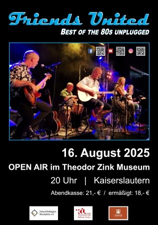 Am Samstag, 16. August 2025, um 20 Uhr bringt die Kaiserslauterer Formation „Friends United“ um Stephan Hugo, Sabrina Roth und Bernd Schreiber die größten Songs eines legendären Jahrzehnts unplugged auf die Bühne – intensiv, leidenschaftlich und voller Emotionen. In der einzigartigen Atmosphäre des historischen Innenhofs des Theodor-Zink-Museums lassen sie die unvergesslichen Hits der 80er in einem völlig neuen akustischen Gewand erstrahlen. Die Besucherinnen und Besucher des Konzerts können sich auf Klassiker von A-ha, Duran Duran, Kim Wilde, Eurythmics, Howard Jones und vielen mehr freuen.