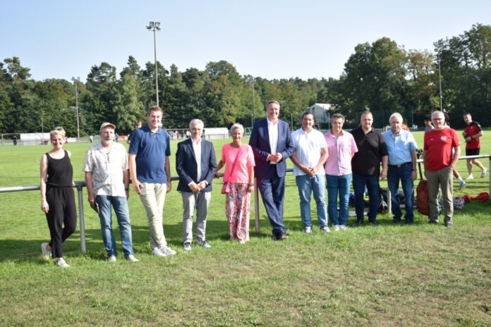 BU3: Die Gruppe bei der Besichtigungstour über das Gelände des Unisports und des TSG 1861 e.V. um Kurt Sendldorfer, Vertreter des Kanzlers der RPTU (4.v.l.), Oberbürgermeisterin Beate Kimmel und Ministerpräsident Alexander Schweitzer (Mitte).
