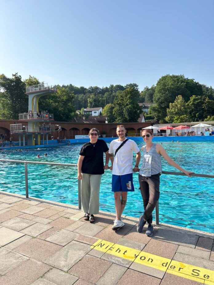 Bei hochsommerlichen Temperaturen war das Streetwork-Team der Stadtverwaltung in den beiden städtischen Freibädern unterwegs. Da sich an heißen Tagen viele junge Menschen im Warmfreibad und in der Waschmühle aufhalten, nutzte das Team die Gelegenheit, direkt vor Ort ins Gespräch zu kommen, auf Unterstützungsangebote aufmerksam zu machen und Fragen zu beantworten. „In der Innenstadt ist es bei dieser Hitze oft ruhig. Also gehen wir dorthin, wo die jungen Leute sind – und das ist bei diesem Wetter in den Bädern“, erklärt Vanessa Strickert, seit Februar Streetworkerin bei der Stadtverwaltung.
