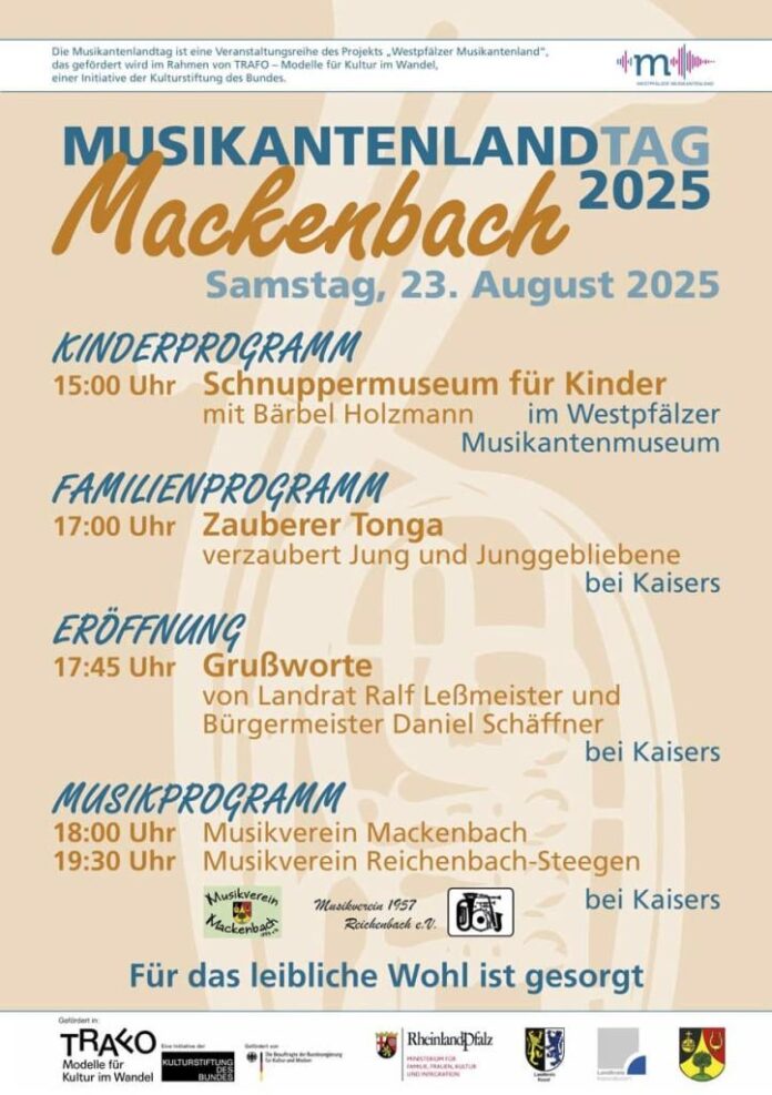 Am Samstag, 23. August, feiert Mackenbach das kulturelle Erbe der Westpfalz mit dem dritten Musikantenlandtag. Ab 15:00 Uhr erwartet die Gäste ein abwechslungsreiches Programm. Den Auftakt bildet eine Kinderführung durch das Westpfälzer Musikantenmuseum mit Museumsleiterin Bärbel Holzmann. Weiter geht es ab 17:00 Uhr in Kaisers Saal mit dem Zauberer Tonga, der das Familienprogramm mit magischen Momenten abrundet. Um 17:45 Uhr begrüßen Landrat Ralf Leßmeister und Ortsbürgermeister Daniel Schäffner die Gäste offiziell. Im Anschluss sorgen die Musikvereine Reichenbach und Mackenbach für musikalische Unterhaltung beim ausgelassenen Dämmerschoppen. Der Musikantenlandtag ist Teil der Veranstaltungsreihe des TRAFO-Projekts „Westpfälzer Musikantenland“ in Kooperation mit regionalen und überregionalen Partnerinnen und Partnern. Für das leibliche Wohl der Besucherinnen und Besucher ist selbstverständlich gesorgt.