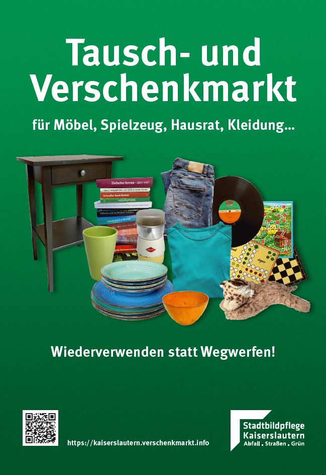Seit acht Jahren bietet die Stadtbildpflege Kaiserslautern daher auf ihrer Homepage unter https://kaiserslautern.verschenkmarkt.info/ einen Tausch- und Verschenkmarkt an. Hier können Bürgerinnen und Bürger einen Beitrag zur Abfallvermeidung leisten und den nachhaltigen Konsum fördern. Mehrere Hundert Artikel wechselten mit Hilfe des Portals schon die Besitzerin und den Besitzer – getreu dem Motto: Wiederverwenden statt Wegwerfen!