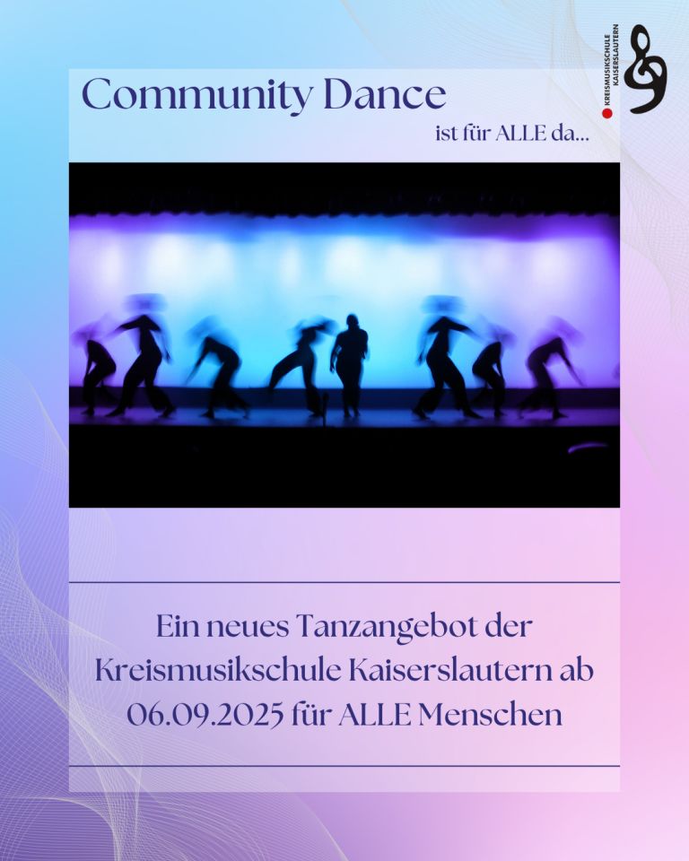 Community Dance ist ein neues Tanzangebot der Kreismusikschule Kaiserslautern ab 6.9.2025 bei dem ALLE Menschen, die Lust auf Bewegung und Musik haben, mitmachen können. In dieser Tanzklasse bewegen wir uns hauptsächlich im Zeitgenössischen/Modernen Tanzstil. Dieser Tanzstil ist sehr vielseitig und ermöglicht es, individuell auf die Tänzer:innen einzugehen. Dadurch ist er für alle zugänglich.