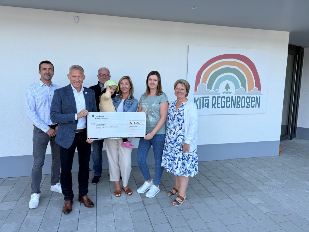 Landrat Ralf Leßmeister und die Fachbereichsleiterin Jugend und Soziales in der Kreisverwaltung Petra Brenk haben am Montagmorgen 25. August ein Scheck über 500 Euro an die Leiterinnen Jasmin Wojtaschek und Elena Romahn von der Kindertagesstätte „Regenbogen“ in Rodenbach übergeben. Mit dabei waren Ortsbürgermeister Markus Schick und auch Joachim Felka von der Eventplanung Felka.