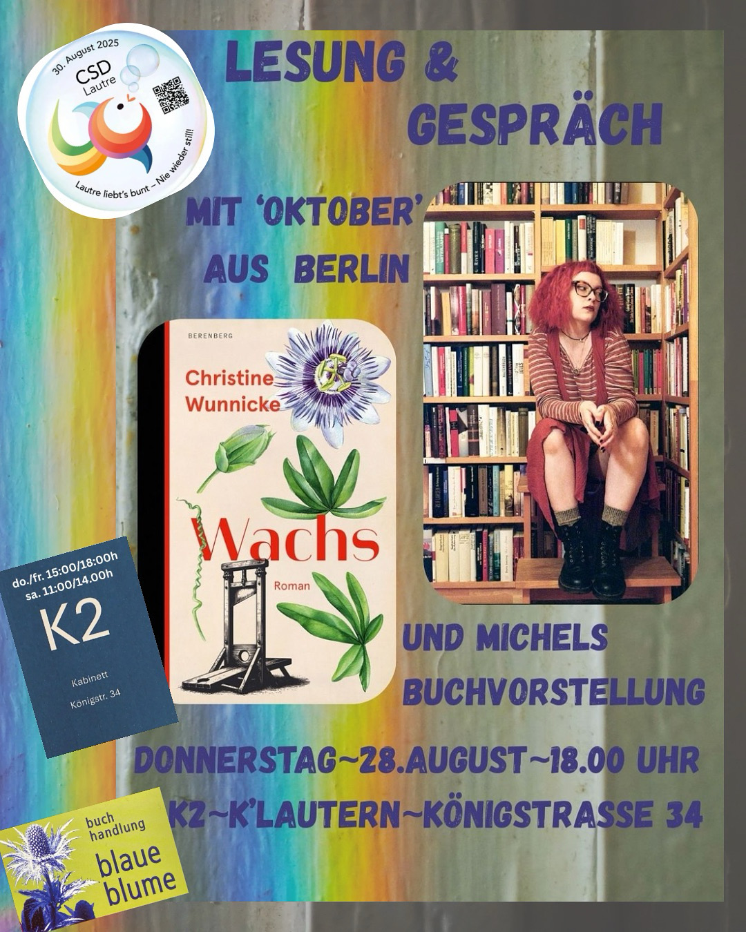 • Was: Lesung & Gespräch mit Oktober (Sängerin, Berlin) und Michels Vorstellung des Romans Wachs von Christine Wunnicke
