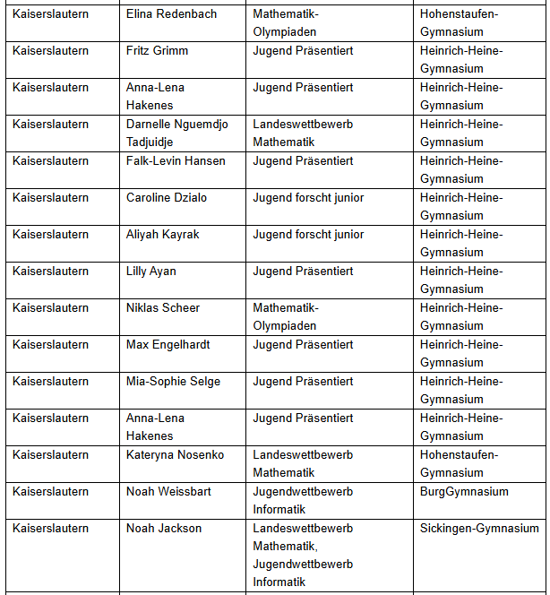 Liste der eingeladenen Landesbesten aus kaiserslautern: