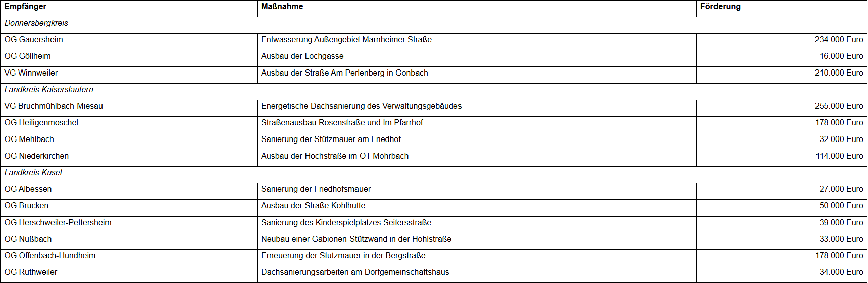 Für den weiteren Ausbau von Ortsstraßen erhalten die Ortsgemeinden Niederkirchen (114.000 Euro), Heiligenmoschel (178.000 Euro, beide Landkreis Kaiserslautern), Brücken (Landkreis Kusel, 50.000 Euro), Göllheim (Donnersbergkreis, 16.000 Euro) und die Verbandsgemeinde Winnweiler (Donnersbergkreis, 210.000 Euro) ebenfalls Fördermittel aus dem Investitionsstock.