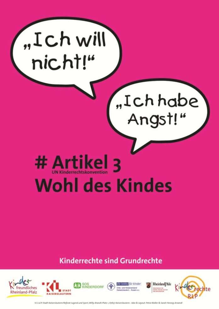 Mit der Plakataktion „Kinderrechte sind Grundrechte“ sollen Kinderrechte in die Öffentlichkeit gebracht werden. Die vier ausgewählten Kinderrechte „Wohl des Kindes“, „Berücksichtigung des Kinderwillens“, „Schutz vor Gewaltanwendung, Misshandlung, Verwahrlosung“ und „Beteiligung an Freizeit, kulturellem und künstlerischem Leben“ stehen exemplarisch für die in der UN-Kinderrechtkonvention verankerten Rechte. Die Plakate werden vom 08. bis 22. September 2025 vor allem im Umfeld der Kaiserslauterer Grundschulen zu finden sein.