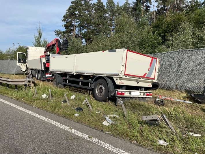 Am heutigen Vormittag kam es auf der A6, Richtungsfahrbahn Saarbrücken zwischen den Anschlussstellen Kaiserslautern West und Einsiedlerhof zu einem Verkehrsunfall. Ein 60-jähriger Lkw-Fahrer verlor mutmaßlich nach einem Reifenschaden die Kontrolle über sein Fahrzeug und kam von der Fahrbahn ab. Die folgende Kollission mit Schutzplanke und Zaun der US-Liegenschaften führte zu erheblichen Beschädigungen an dem Sattelzuggespann. Der Fahrzeugführer blieb glücklicherweise unverletzt. Bis zum Abschluss der Bergungsarbeiten verbleibt der rechte Fahrstreifen gesperrt. Die Schadenssumme beläuft sich nach ersten Schätzungen auf 55.000 Euro.|kle