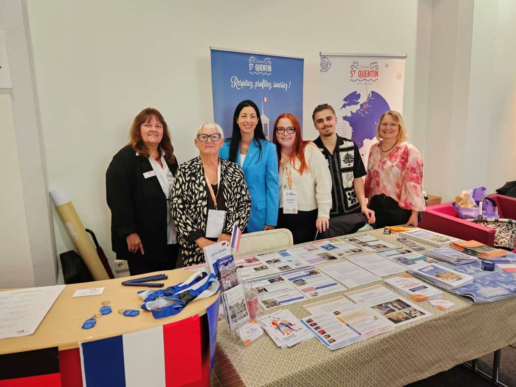 Foto 3 zeigt Anja Pfeiffer am Stand der Städtepartnerschaften / Europe Direct mit der Delegation aus Saint-Quentin. Die Partnerstadt ist ebenfalls mit einem Stand in der Fruchthalle vertreten.