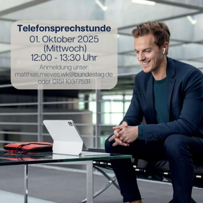 Der Bundestagsabgeordnete Matthias Mieves (SPD) bietet am Mittwoch, den 01. Oktober, von 12:00 bis 13:30 Uhr seine Telefonsprechstunde an. Interessierte Bürgerinnen und Bürger aus seinem Wahlkreis können mit ihm über ihre Anliegen sprechen. Anmeldungen erfolgen unter matthias.mieves.wk@bundestag.de oder unter 0151 10377531.