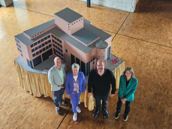 Wer beim Eingang ins Rathaus das echte Pfalztheater übersehen haben sollte, kann sich bis Anfang Dezember nun auch im Rathausfoyer ein Bild von dem markanten Sandsteingebäude machen. Im oberen Foyer steht seit wenigen Tagen ein Modell des Theaters aus Pressspan, das von der Theaterwerkstatt anlässlich des 30-jährigen Jubiläums für das Stück „feste feiern“ angefertigt wurde. Es steht auf einer Basisplatte, die etwa 210 mal 220 cm groß ist. Bei der „Übergabe“ an Oberbürgermeisterin Beate Kimmel dabei waren neben dem künstlerischen Direktor Daniel Böhm auch die Kaufmännische Direktorin Simone Grub und Michael Krauß, Vorstand der „Freunde des Pfalztheaters“.