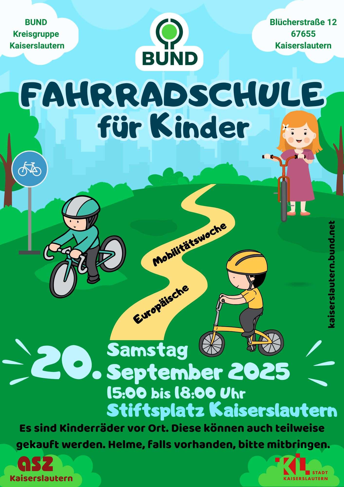 Nach dem großen Erfolg im vergangenen Jahr veranstaltet der BUND Kaiserslautern gemeinsam mit der ASZ-Fahrradwerkstatt und in Kooperation mit der Stadt Kaiserslautern auch in diesem Jahr wieder einen Fahrradlerntag im Rahmen der Europäischen Mobilitätswoche.