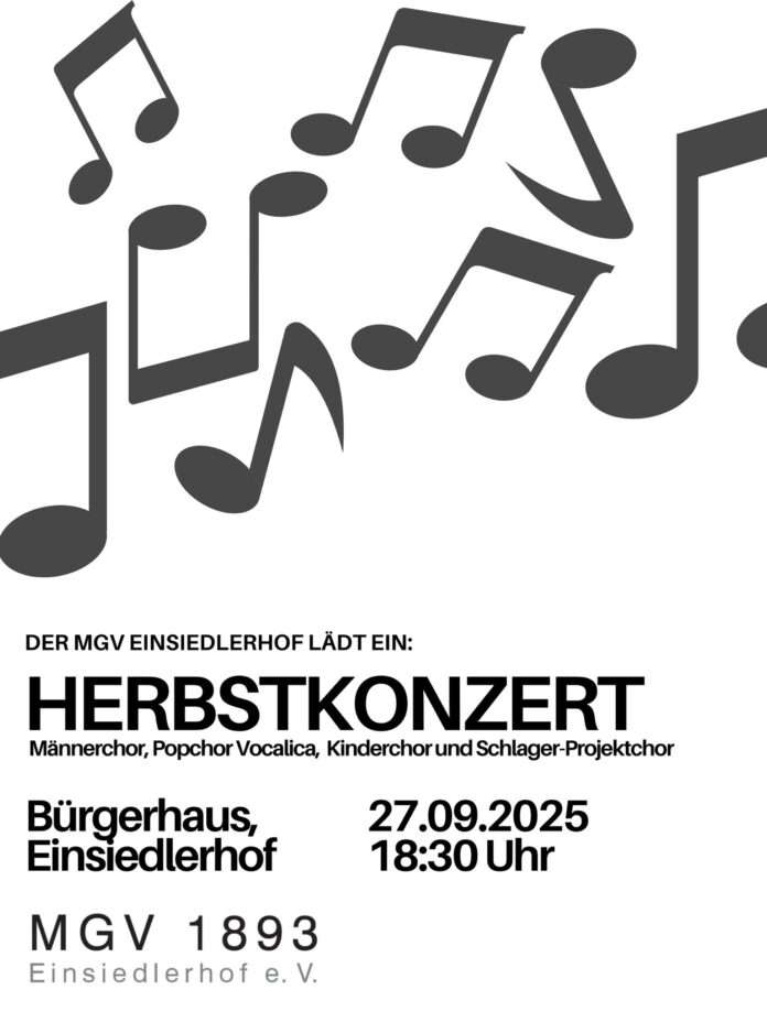 Am Samstag, den 27. September 2025, lädt der Männergesangverein Einsiedlerhof zu einem besonderen musikalischen Abend ein. Das Herbstkonzert findet um 18:30 Uhr im Bürgerhaus Einsiedlerhof statt. Der Eintritt ist frei.