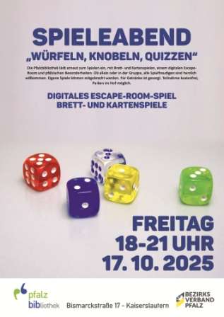 Der Spaß geht in die zweite Runde: Nach dem großen Erfolg des ersten Spieleabends im April findet am 17. Oktober 2025 von 18:00 bis 21:00 Uhr in der Pfalzbibliothek wieder eine Spieleaktion für Jung und Alt statt. Unter dem Motto „Würfeln, knobeln, quizzen“ werden ein digitales Escape-Room-Spiel sowie viele neu angeschaffte Brett- und Kartenspiele angeboten.