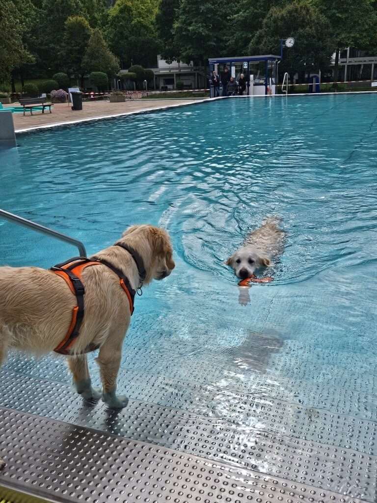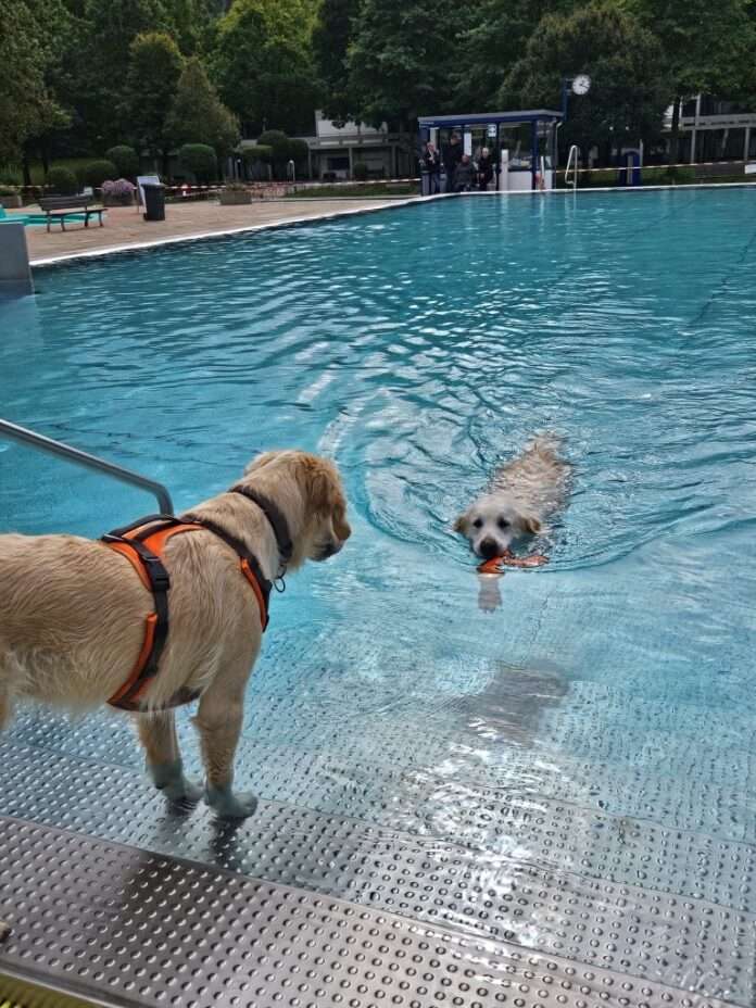 Nach dem Ende der Kaiserslauterer Freibadsaison am 21. September 2025, hatte das Warmfreibad am Samstag, 27. September, abschließend noch einmal für Vierbeiner geöffnet: Beim Hundeschwimmen konnten Hunde aller Rassen nach Herzenslust planschen, schwimmen oder sich am Beckenrand mit dem Wasser vertraut machen. Das beliebte Angebot nutzten trotz des bedeckten Himmels 42 Hundebesitzerinnen und -besitzer, um ihren tierischen Begleitern ein besonderes Erlebnis zu bieten.