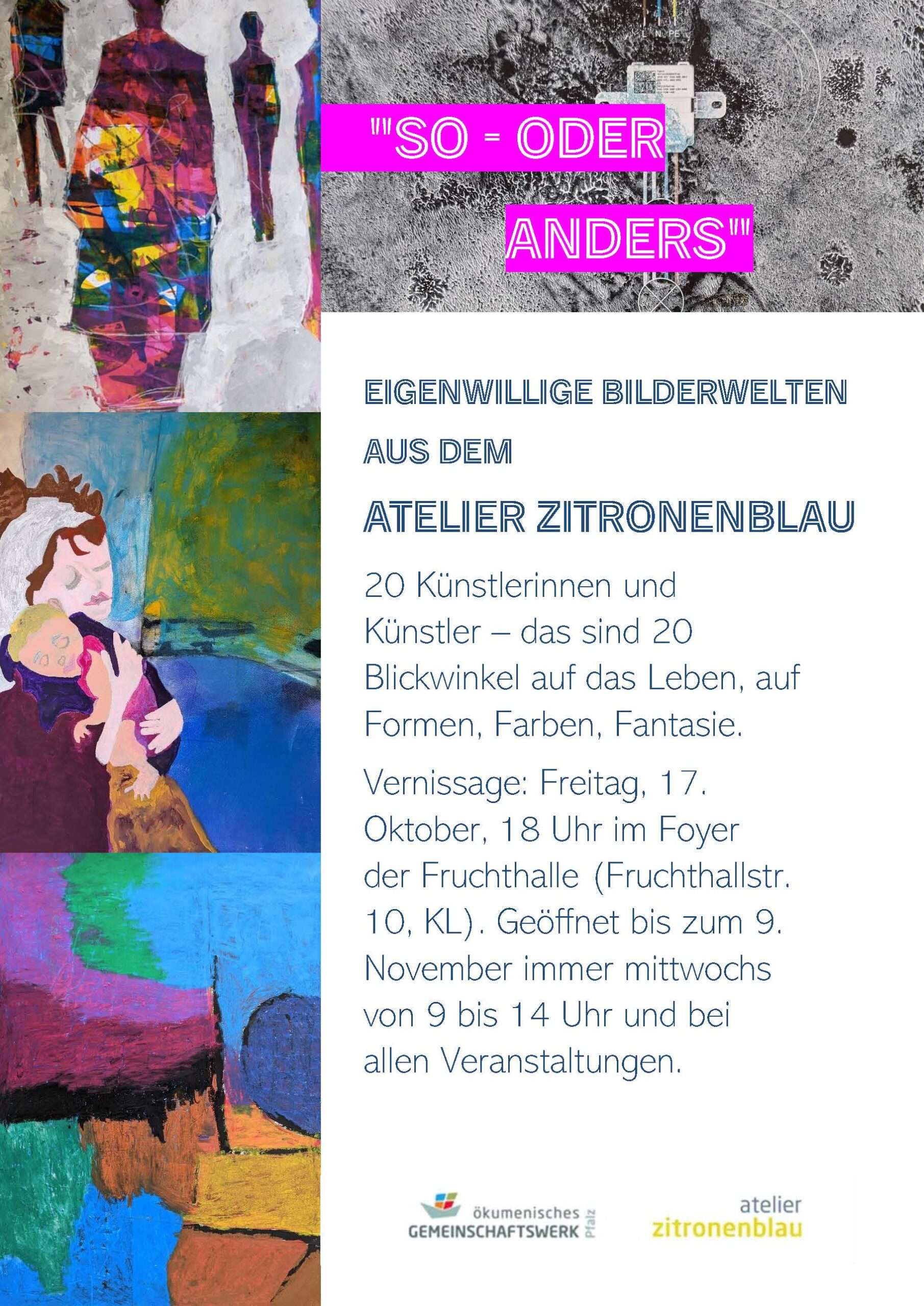 Das Atelier Zitronenblau lädt ein zur Ausstellung „So – oder anders“ im Foyer der Fruchthalle: Zu entdecken ist eine Welt voller Farbe, Spontanität und ehrlicher Ausdruckskraft. Das Atelier Zitronenblau ist ein inklusives Kunstangebot des Ökumenischen Gemeinschaftswerks Pfalz in Kaiserslautern. Im Atelier arbeiten Kunstschaffende mit und ohne Beeinträchtigung miteinander in der Friedrichstraße 7. Hier wird Kunst als Ausdrucksmöglichkeit, als Raum für Individualität und Vielfalt, für Teilhabe und für schöpferische Selbstbestimmung verstanden.