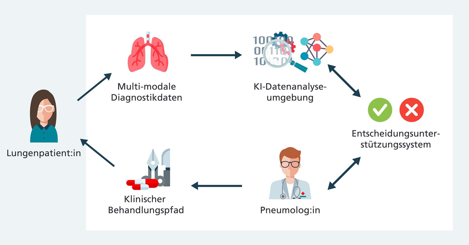 Auf Grundlage der Analyseergebnisse hilft ein klinisches Entscheidungsunterstützungssystem den behandelnden Ärztinnen und Ärzte dabei, gemeinsam mit den Patientinnen und Patienten den individuell besten Therapiepfad zu bestimmen. Dabei kommen Methoden der mehrkriteriellen und sequenziellen Entscheidungsfindung, wissensbasierte Systeme sowie Ansätze der erklärbaren und ethischen KI zum Einsatz.