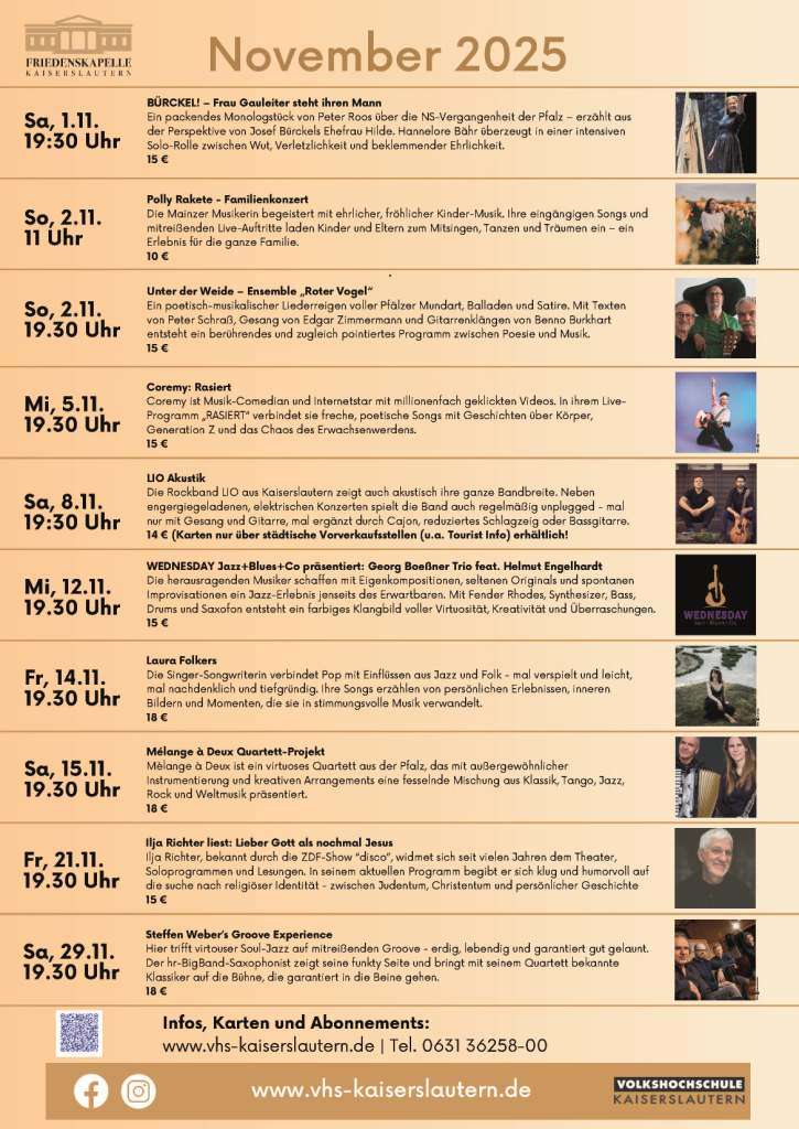 Über die Volkshochschule Kaiserslautern Für Ticketreservierungen können Sie sich auch gerne telefonisch oder per E-Mail direkt an uns wenden.