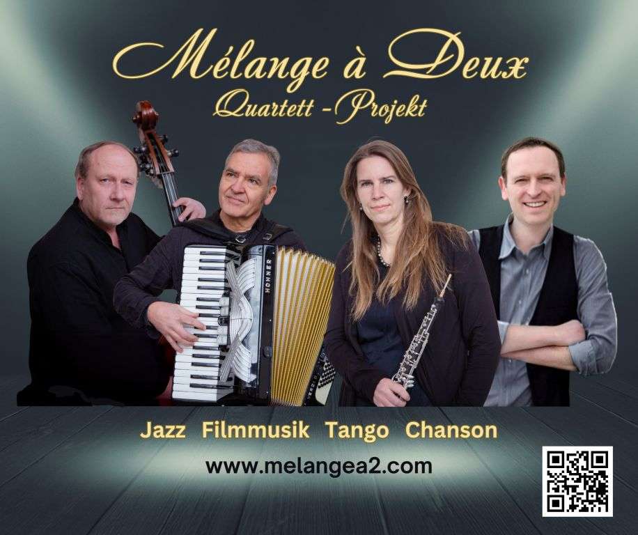 Was passiert, wenn klassische Perfektion auf musikalische Neugier trifft? Wenn eine erfahrene Oboistin auf einen kreativen Multiinstrumentalisten trifft? Dann entsteht ein Konzertabend voller Klangfarben, überraschender Arrangements und mitreißender Vielfalt. Mélange à Deux – gegründet von Ulrike Albeseder (Oboe, Blockflöte) und Uwe Hanewald (Akkordeon) – vereint seit 2017 musikalische Welten zu einem stimmigen Ganzen. Inzwischen zum Quartett gewachsen, bereichern Wolfgang Mayé (Kontrabass) und Wolfgang Disch (Percussion) das Ensemble mit rhythmischer Raffinesse und klanglicher Tiefe.