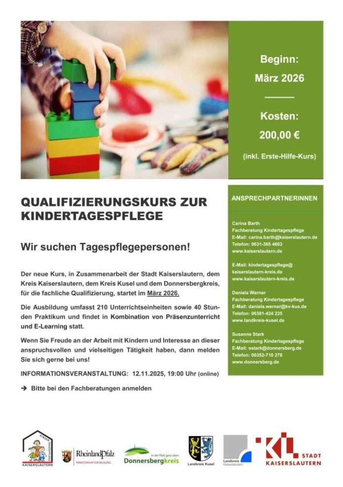 Wer Lust auf neue Erfahrungen hat und sich vorstellen kann, als Kindertagespflegeperson zu arbeiten, hat demnächst erneut die Gelegenheit, sich zu qualifizieren. Die Stadt Kaiserslautern bietet 2026 in Zusammenarbeit mit den Landkreisen Kaiserslautern, Kusel und Donnersbergkreis eine neue Qualifizierungsmaßnahme für angehende Tagespflegepersonen an.