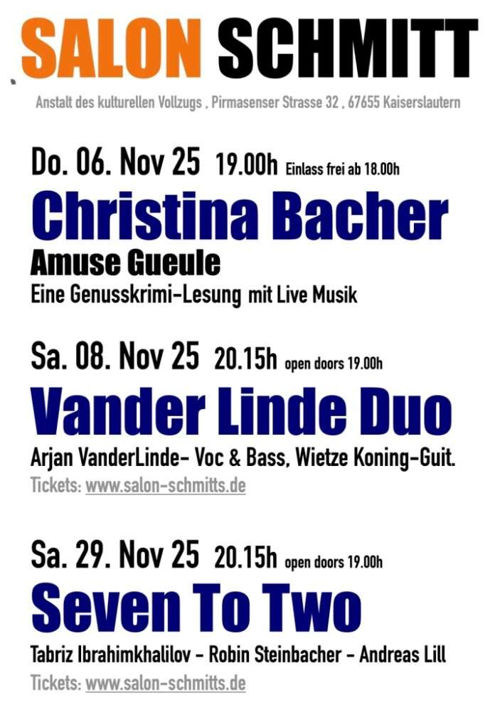 Vander Linde Duo mit feinstem Pop aus den Niederlanden per Gitarre, Bass und GesängenBeginn: 20.15h – Einlass: 19.00Tickets wie immer über www.salon-schmitts.de