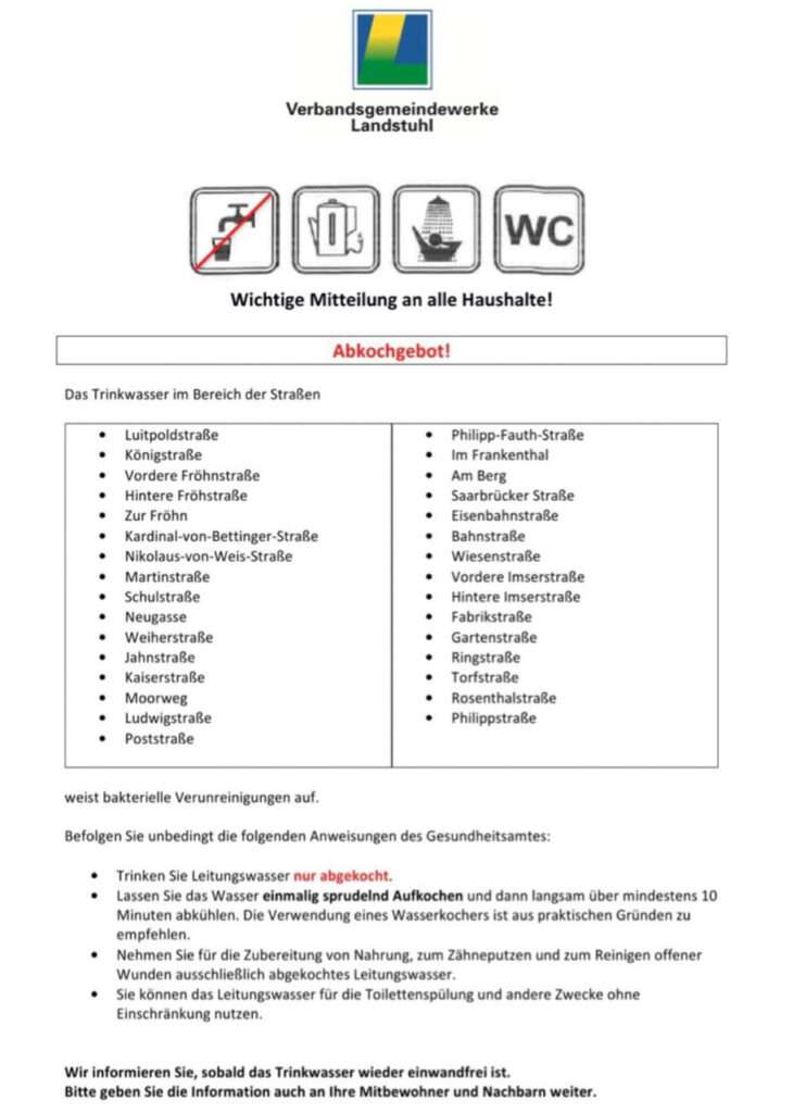 Das Gesundheitsamt des Landkreises Kaiserslautern und die Verbandsgemeindewerke Landstuhl weisen darauf hin, dass das Trinkwasser in den nachfolgend genannten Straßen in der Sickingenstadt Landstuhl, bakterielle Verunreinigungen aufweist.