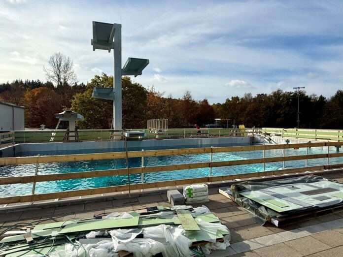 Wie Projektleiter Peter Jost berichtet, war das Kernstück der aufwendigen Arbeiten die Installation der Edelstahlplatten im Beckeninneren, die nun abgeschlossen sind. Nach der Befüllung folgten nun die Prüfung zur Dichtigkeit sowie die Herstellung des Beckenumgangs. Parallel werden Restarbeiten am Sprungturm und an der Umgebung durchgeführt, so dass der Turm und das Becken dann pünktlich zur neuen Saison 2026 genutzt werden können.