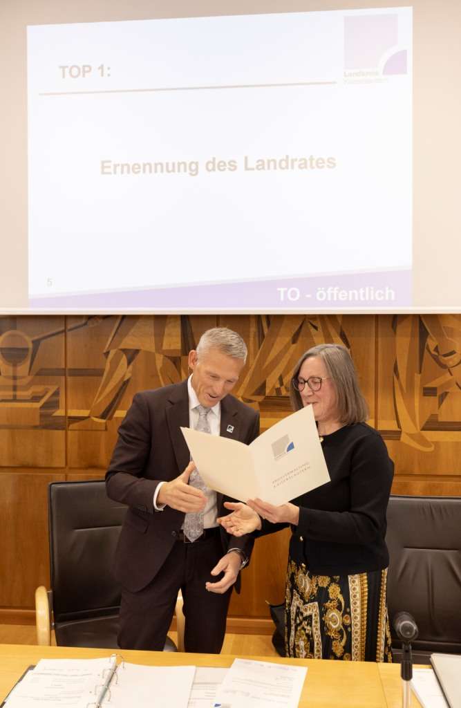 In der Sitzung des Kreistages am Montag, 10. November, wurde Ralf Leßmeister (CDU) erneut zum Landrat des Landkreises Kaiserslautern ernannt. Die Erste Kreisbeigeordnete Gudrun Heß-Schmidt überreichte Leßmeister seine Ernennungsurkunde.