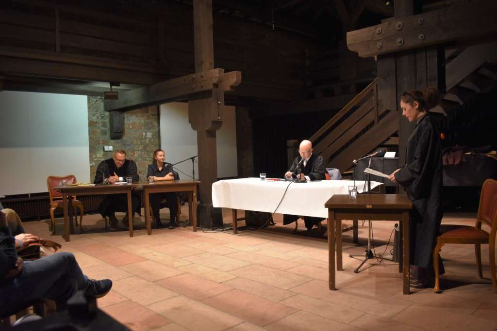 Fiktiv standen Hänsel und Gretel vor Gericht. Die Anklage lautete auf Hausfriedensbruch bei der Hexe sowie deren Ermordung. Die Rolle des Richters hatte Alexander Schwarz inne, Vorsitzender Richter am Oberlandesgericht in Zweibrücken. Rechtsanwältin Inga Neumüller trat als Staatsanwältin auf und Professor Thomas Söbbing als Anwalt von Hänsel und Gretel. So war die Aufführung juristisch fundiert, obwohl zwischendurch das ein oder andere Augenzwinkern nicht fehlen durfte.