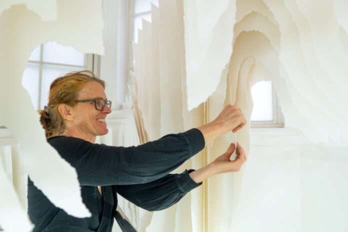 Angela Glajcar zählt zu den profiliertesten Künstlerinnen in Rheinland-Pfalz. Mit ihren immersiven, raumgreifenden Papierobjekten ist die Künstlerin in vielen öffentlichen Gebäuden des Bundeslandes präsent und hat sich inzwischen international einen Namen gemacht. Das mpk schätzt sich glücklich, dass Glajcar kurz bevor sie in der Albertina in Wien gezeigt wird, im Jubiläumsjahr des mpk eine ortsspezifische Installation realisiert hat, die auf besondere Weise die historische Architektur erfahrbar macht. „Den Raum für uns fühlbar zu machen und dass an diesem Projekt alle an einem Strang gezogen haben, macht mich sehr glücklich.“, freut sie sich.
