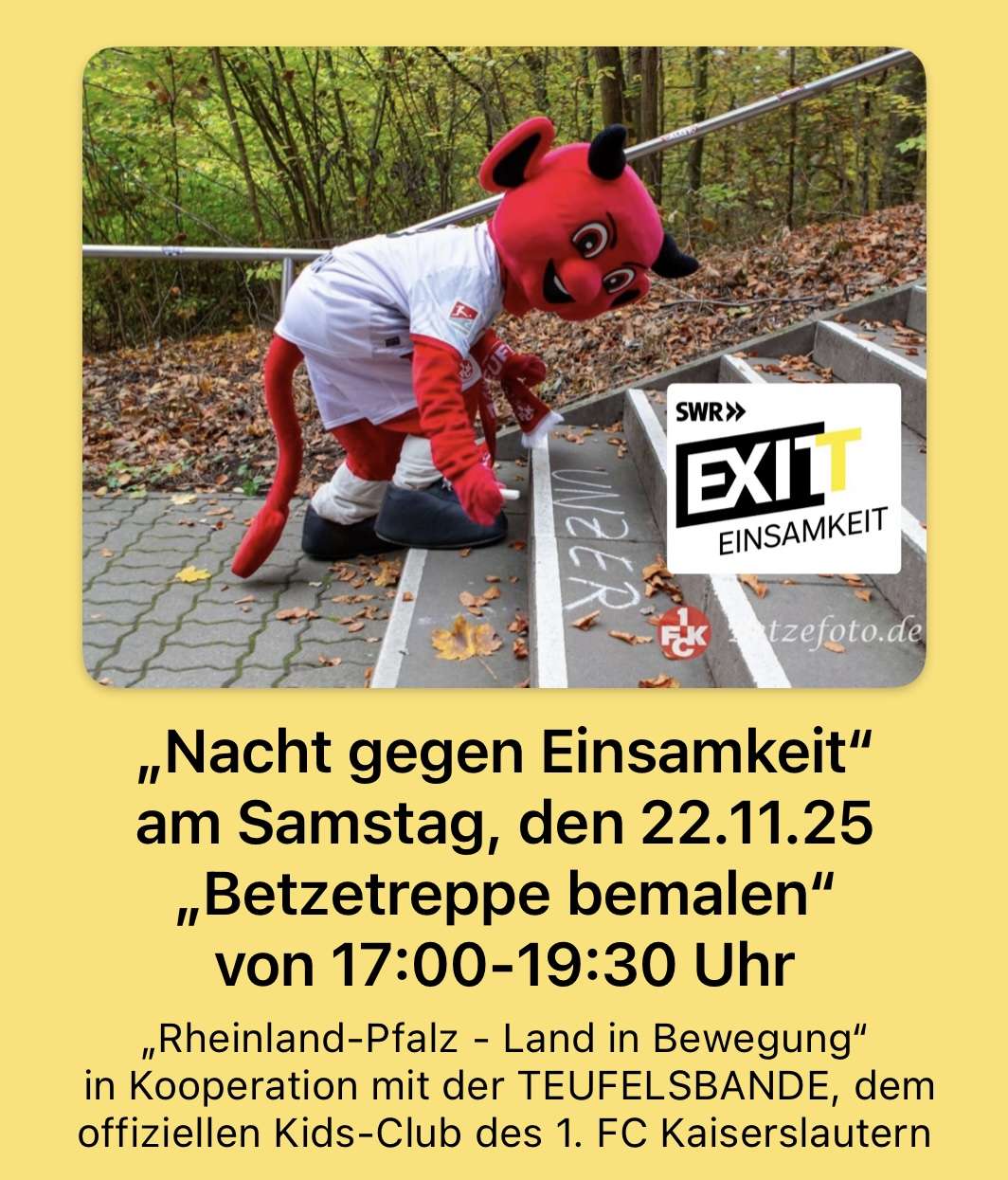 Die Landesinitiative „Rheinland-Pfalz – Land in Bewegung“ in Kooperation mit der TEUFELSBANDE, dem offiziellen Kids-Club des 1. FC Kaiserslautern, laden ganz herzlich zum „Betzetreppe bemalen“ ein.
