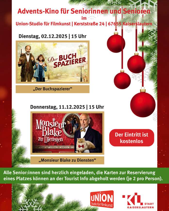 Auch in der diesjährigen Adventszeit bieten die Arbeiterwohlfahrt und die Stadt Kaiserslautern zwei besondere Veranstaltungen an: Seniorinnen und Senioren sind am Dienstag, 2. Dezember, und Donnerstag, 11. Dezember, um jeweils 15 Uhr zu einer Filmvorführung im Union Studio für Filmkunst eingeladen. Der Eintritt ist kostenlos.