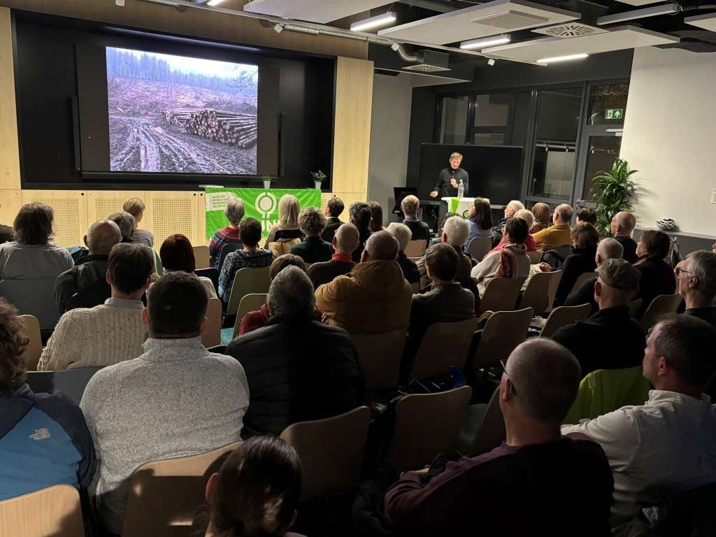 Dieses Konzept ging voll auf: Mehr als 80 Personen kamen zu dem Vortrag in die Eisenbahnstraße. Gerald Klamer zeigte nicht nur beeindruckende Bilder von allen größeren Waldgebieten in Deutschland. Er ging auch auf die Probleme durch die Waldbewirtschaftung ein. Durch den Einsatz schwerer Maschinen wird Boden verdichtet. Ein geschickter Einsatz der Maschinen kann diese Verdichtung um die Hälfte reduzieren. Das lebenswichtige Wasser kann so besser im Wald gehalten werden, das sehr sensible Ökosystem Boden wird besser geschützt. Klamer betonte auch die Kraft des Waldes als CO2 Senke im Kampf gegen die Klimakrise. Durch den Aufbau von Mischwäldern mit mehr Holzvorrat pro ha Fläche kann auf Dauer eine Humusschicht aufgebaut werden, die viel CO2 speichert. Hierfür ist es auch sinnvoll, mehr Flächen komplett aus der Nutzung zu nehmen. Dies trägt auch zur Erhöhung der Biodiversität bei. Damit werden die Lebensgesellschaften, zu der letztendlich auch wir Menschen gehören, besser vor Krisen geschützt.