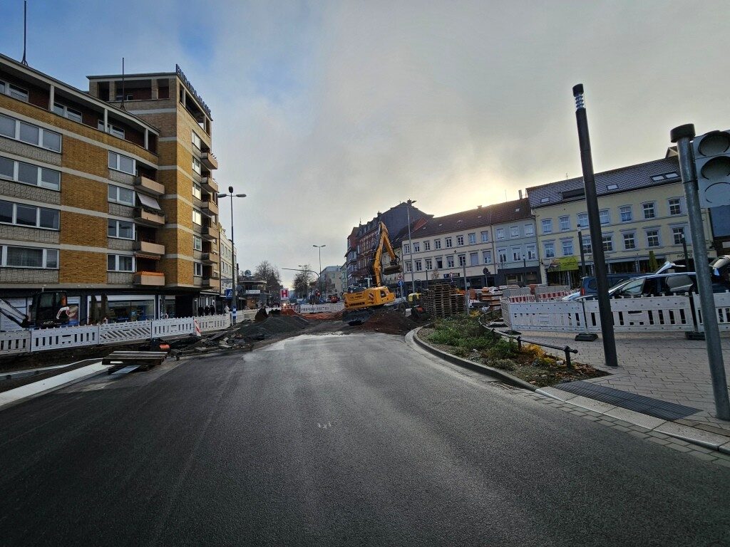 Seit nunmehr gut drei Jahren – seit September 2022 – laufen im Umfeld von Fackelbrunnen und Fruchthalle die Arbeiten zum Bau des neuen Busknotenpunkts, der Erneuerung von Fruchthallstraße und Burgstraße sowie zur Umsetzung aller damit verbundener Planungen. „Das allermeiste ist gemacht“, so Baudezernent Manuel Steinbrenner bei einem Vor-Ort-Termin am Dienstagmorgen. Das Ziel des „Riesenprojekts“ Neue Stadtmitte – ein komplett neu gestalteter, hochwertiger Innenstadtkern mit moderner und barrierefreier ÖPNV-Anbindung – sei wieder ein Stück näher gerückt. Steinbrenner freute sich über den nahezu reibungs- und geräuschlosen Verlauf der Bauarbeiten in den vergangenen drei Jahren – auch und vor allem dank der hervorragenden Kommunikations- und Abstimmungsarbeit des Tiefbaureferats. „Es ist schön, dass nun bald wieder Normalität einkehrt. Mein Dank gilt allen Beteiligten und auch den Anwohnerinnen und Anwohnern für das Verständnis.“